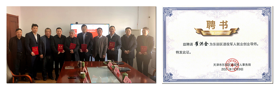 崔洪金董事長(cháng)獲得區退役軍人事務(wù)局頒發(fā)的就業(yè)創(chuàng )業(yè)導師證書(shū)