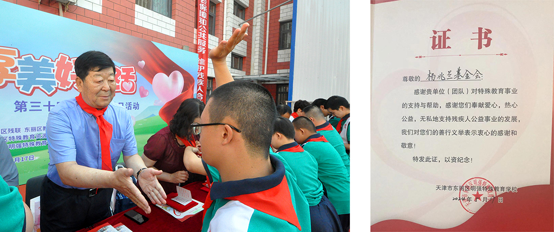 表彰會(huì )議在雄壯的國歌聲后隆重開(kāi)始,少先隊員代表為各位參會(huì )領(lǐng)導、來(lái)賓敬獻紅領(lǐng)巾,孩子們用特殊的方式表達了對各位領(lǐng)導和來(lái)賓的尊敬愛(ài)戴與熱情歡迎。接著(zhù),吳會(huì )新校長(cháng)代表學(xué)校致感謝詞,向一直以來(lái)關(guān)心、支持學(xué)校發(fā)展的企事業(yè)單位和社會(huì )愛(ài)心人士表達了誠摯的謝意?!胺鰵堉?,善舉濟世,關(guān)愛(ài)生命,回報社會(huì ),推動(dòng)天津市慈善事業(yè)發(fā)展”是天津市楊兆蘭慈善基金會(huì )發(fā)展的宗旨,自基金會(huì )成立以來(lái),已向東麗區民強特教學(xué)校捐款100余萬(wàn)元,用于支持本區特殊教育事業(yè)。在本次活動(dòng)的頒獎環(huán)節,民強學(xué)校吳會(huì )新校長(cháng)特別向安達集團代表頒發(fā)證書(shū),以示楊兆蘭慈善基金會(huì )多年來(lái)對特殊教育事業(yè)的支持與感謝。