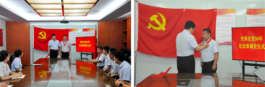 七一當天,集團本部舉行了莊重而溫馨的 “光榮在黨 50 年” 紀念章頒發(fā)儀式。集團黨委書(shū)記、董事長(cháng)崔洪金親自為一支部黨員黃柏燁、孔令奇頒發(fā)紀念章。因路途遙遠未能到場(chǎng),由支部黨員代為領(lǐng)取。崔洪金書(shū)記表示,兩位老黨員 50 年如一日堅守初心、忠誠于黨,是集團全體黨員學(xué)習的榜樣,希望大家以他們?yōu)闃藯U,傳承紅色精神,立足崗位擔當作為。